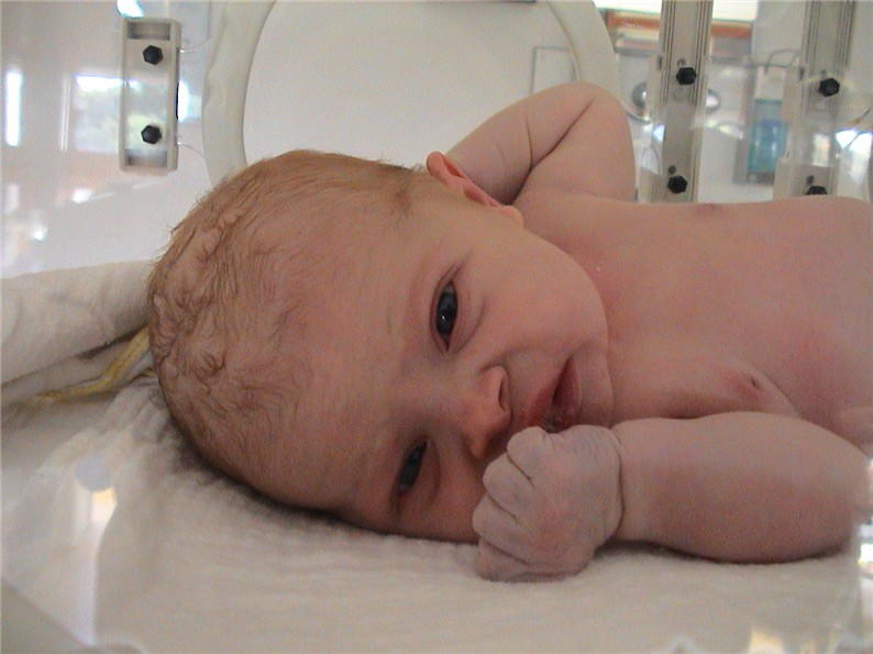 Hier is ze een half uur oud, en ligt ze (fris gewassen) in de couveuse op de kinderafdeling in het ziekenhuis in Nijmegen.