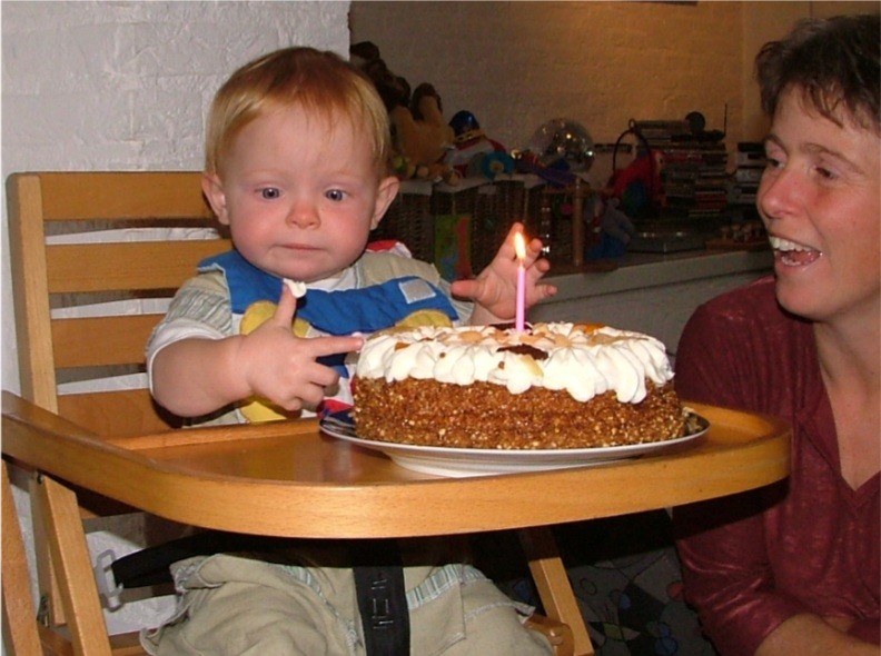 Eén jaar oud. Ze heeft echt genoten van haar verjaardag! Heerlijk taart eten (niet eens echt knoeien), lekker zelf drinken uit een beker met een rietje. Kadootjes uitpakken, met balonnen spelen, naar de slingers kijken, het was fantastisch!