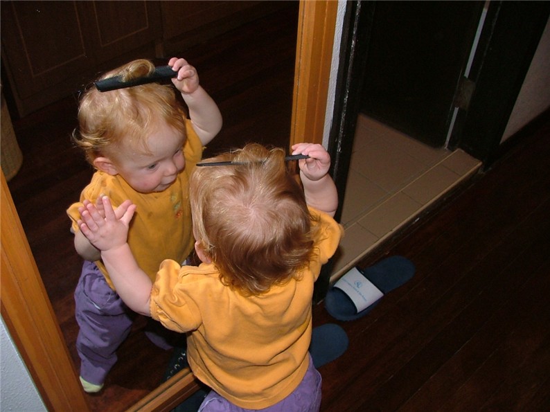 Eén jaar en een maand oud. Op vakantie in Maleisië voor de spiegel met een kam. Dit heeft ze helemaal zelf bedacht. Die kam heeft ze op bed gevonden en daarmee heeft ze zelf deze 'pose' ingenomen. Is het een meid of niet???!