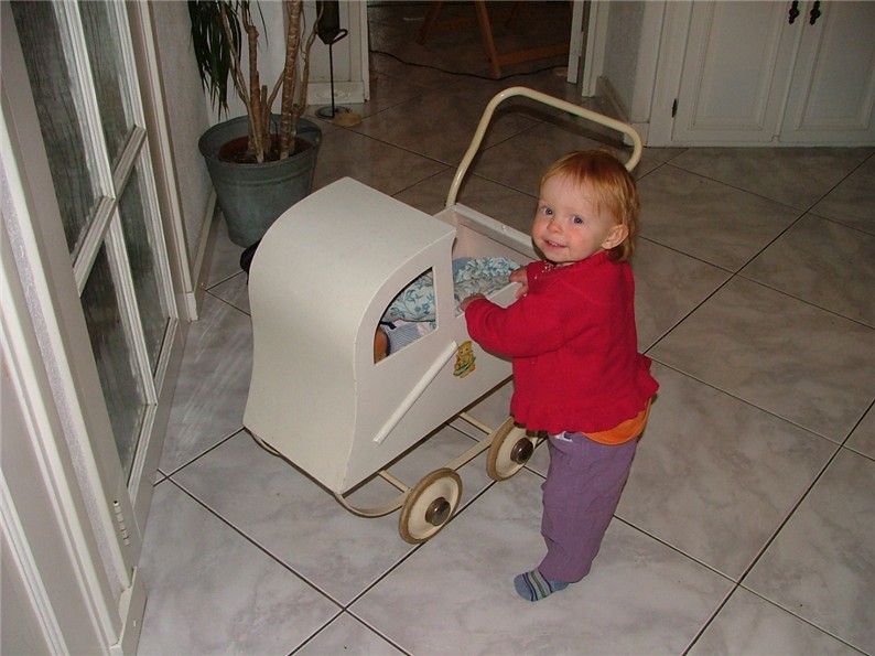 Eén jaar en twee maanden oud. De poppenwagen begint interessant te worden. Ze loopt hier langs de wagen, want het handvat is toch nog wel erg hoog!