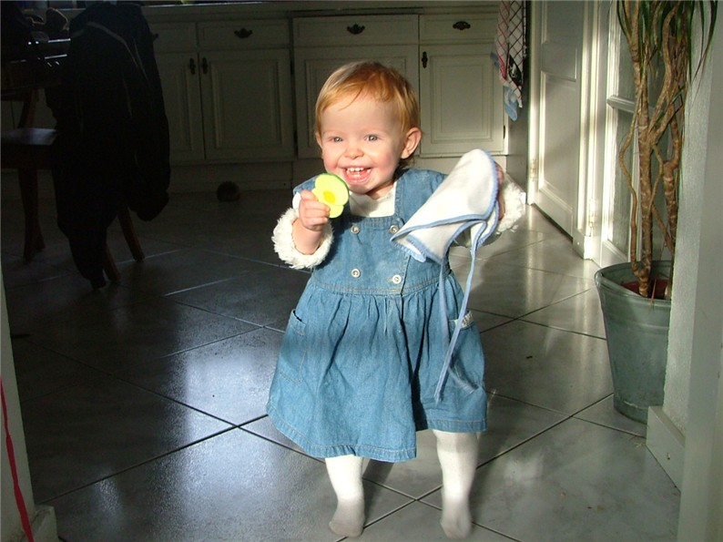 Eén jaar en drie maanden oud. Ze loopt!!! Vanaf de eerste keer dat ze los liep kon ze het ook meteen goed. Ze loopt nu de hele dag door het huis te wandelen en ook buiten, met schoentjes aan, gaat het al heel goed.
