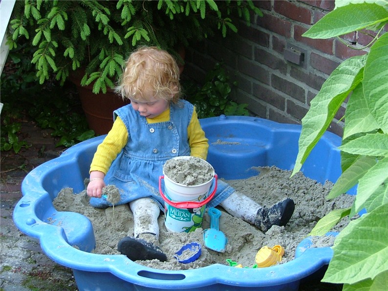Eén jaar en acht maanden oud. Voor het eerst in haar eigen zandbak! Het geeft niks dat ze NET uit bad kwam...