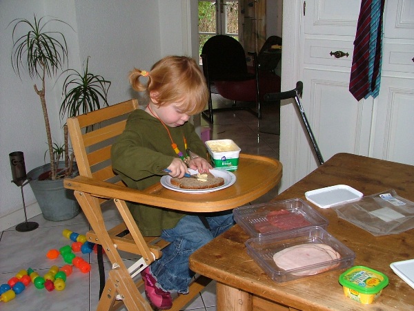 Zelf boter op haar brood smeren. Het gaat natuurlijk nog niet helemaal vanzelf, maar er komt toch al echt boter op, en het wordt ook al een beetje uitgesmeerd. Leuk!
