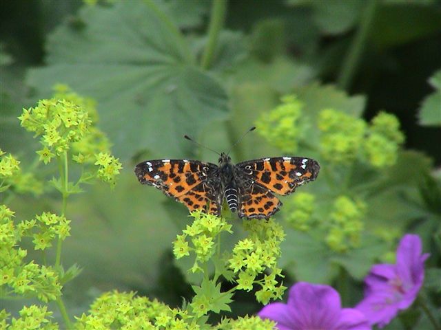 Landkaartje Dit is een vlinder van de voorjaarsgeneratie. Hier zit hij op een bloem van de vrouwenmantel. Je zou zeggen dat het om een compleet andere vlinder gaat omdat hij totaal andere kleuren en tekening heeft dan de zomergeneratie. |
