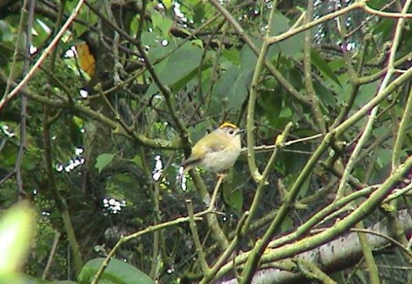 Goudhaantje Het goudhaantje is het kleinste vogeltje van ons land en is vooral te vinden in naaldbossen. Hier zit hij op een tak van een sering vlakbij een uit de kluiten gewassen kerstboom in onze houtwal. Ik hoorde hem eerst en toen ging ik kijken in de naaldboom waar het geluid vandaan kwam, en inderdaad: daar zat ie! Erg moeilijk te fotograferen omdat ie én heel klein is én ontzettend beweeglijk. Maar het is gelukt! |