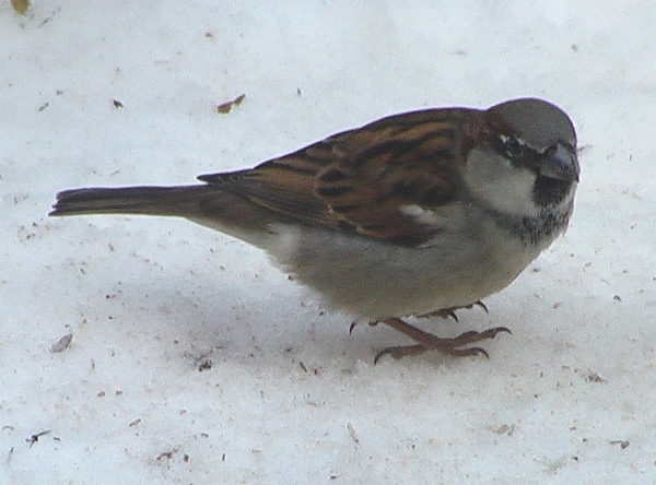 Huismus De Huismus klinkt als de meest voorkomende vogel in tuinen. Toch is dat bij ons absoluut NIET het geval! Ik heb hem in het begin dat we hier woonden wel eens in de tuin gezien maar vond dat niet bijzonder. Totdat ik bij ging houden welke vogels ik zag in onze tuin en daar zat nooit de Huismus bij, ik denk dat ik hem in de dertien jaar dat we hier nu wonen een keer of vijf gezien heb! En nu pas is het voor het eerst gelukt om hem op de foto te zetten, dat is toch wel heel bijzonder voor zo'n 'gewone vogel'. Bij onze buren komt hij wel in de tuin voor, zij hebben een kippenren, maar kennelijk is het daar zo goed dat ze nooit naar ons toe komen. Nu was de winter zo streng met een hele dikke pak sneeuw (wel 20 cm), en nu was hij een paar dagen achter elkaar in onze tuin te zien. |