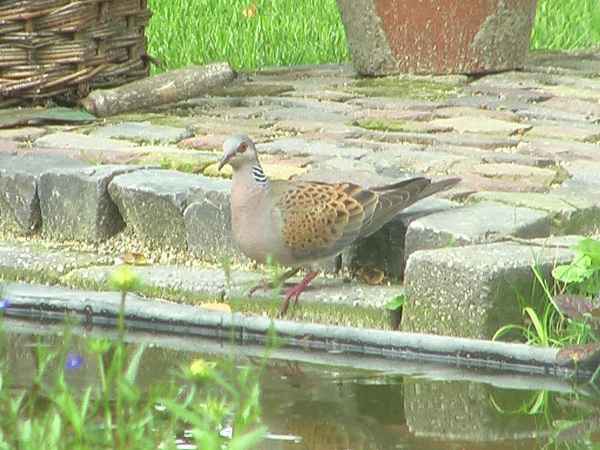 Zomertortel Het Zomertortel heb ik meteen het eerste jaar dat we hier woonden al in de tuin gezien. Toen wist ik echter nog niet dat dit best bijzonder was! De Zomertortel is de enige duif in Nederland die in de winter weg trekt. Het is meer een bewoner van bossen dan van tuinen. Inmiddels hebben we hem jaren niet meer gezien, maar sinds vorig jaar horen we hem echt dagelijks en laat hij zich ook regelmatig zien. Zoals hier, toen zat hij rustig water te drinken uit onze nieuwe vijver op de plaats waar nog een bruggetje moest komen. |