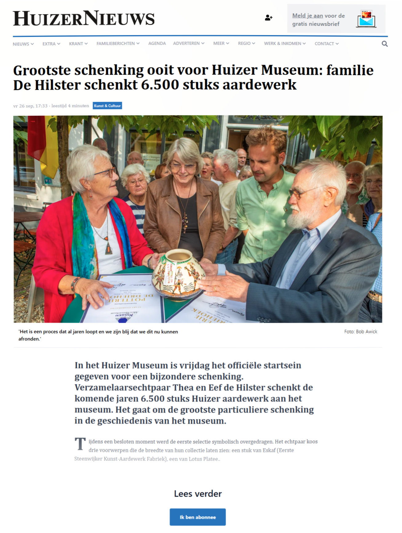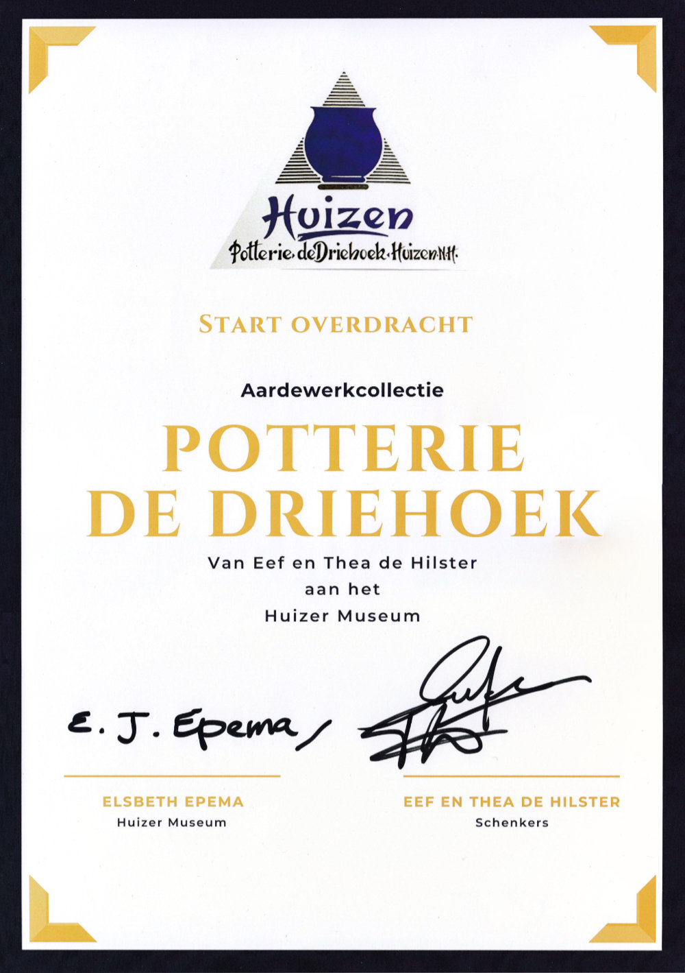 Ook een verzamelaar heeft niet het eeuwige leven. Onze collectie Huizer aardewerk (ESKAF Huizen, Lotus Plateel en Potterie de Driehoek) vindt een goed onderkomen. Op 26 september 2025 is onze schenking aan het Huizer Museum officieel met handtekeningen bekrachtigd. Als vrijwilligers van het museum zullen we de komende jaren de beider collecties in elkaar schuiven. Hierbij zal - overeenkomstig het verzamelbeleidsplan voor serviezen uit 2017 - ook uit beide collecties moeten worden afgestoten. Wat van onze collectie niet in die van het museum wordt opgenomen mag worden verkocht. De opbrengst komt in een Goois aardewerkfonds waaruit bijvoorbeeld restauraties en aankopen kunnen worden gedaan. De verkoop vindt ook plaats in het museum zelf.