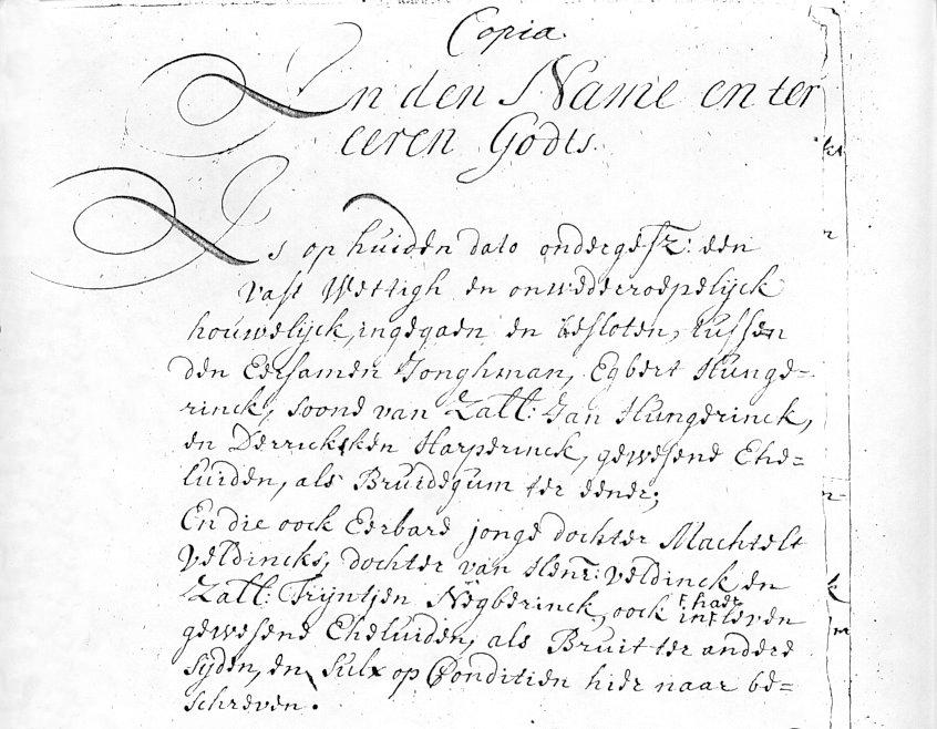 The opening of the 1720 wedding contract between Egbert Hungerinck and Machtelt Veldincks. Also stating the names of their parents. They would inherit de Hunger.