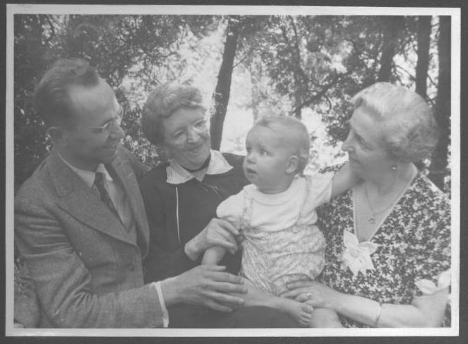 Gerrit Jan Hungerink in 1944(?), on the arm of his grandmother Elisabeth (Betsy) Uitman, looking at his father Gerrit Adriaan, his greatgrandmother looking at him.
