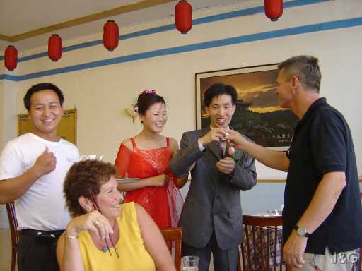 Tijdens onze lunch onderweg zagen we een trouwerij. Hier drinkt Anton met het bruidspaar een borrel op hun gezondheid. (Goedkoopste lunch die we tijdens onze reis hebben gehad, 4,5 euro met 4 personen)