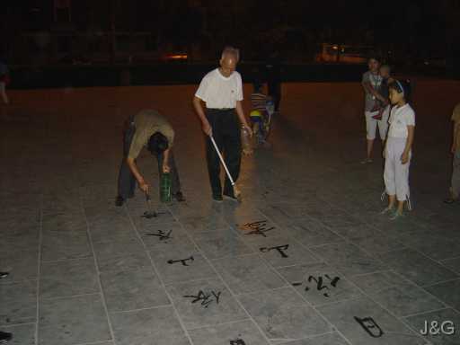 Hier schrijven (tekenen) ze met water chineese tekens op de grond.