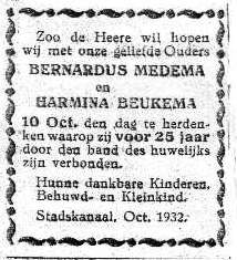 Harmina Beukema, geb. 31-10-1887 te Feerwerd (Ezinge) overl. 9-3-1966 te Stadskanaal (Wildervank)