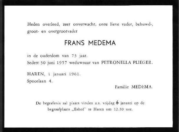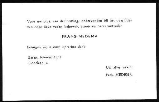 Frans (Mennes) Medema, arbeider, r5angeerder, spoorwegbeambte geb. 3-4-1887 te Adorp overl. 1-1-1961 te Haren en aldaar begraven