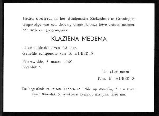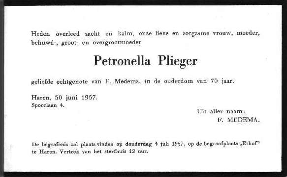 Petronella Plieger, dienstbode geb. ca.10-2-1887 te Zuidhorn overl.30-6-1957 te Haren en aldaar begraven ("Eshof")
