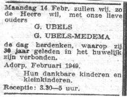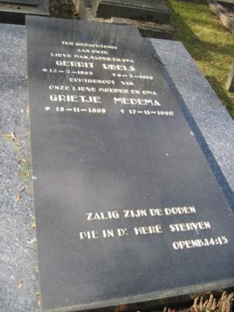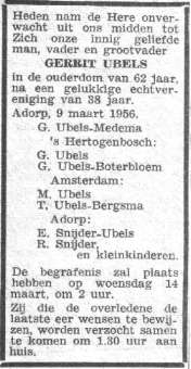 Gerrit Ubels, timmerman te Adorp geb. 12-5-1893 te Roden overl. 9-3-1956 tijdens werk te Groningen, begr. te Adorp