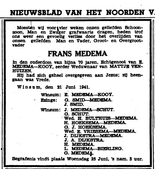 Harm (Frans Douweszoon) Medema, landbouwersknecht, later winkelier geb. 3-1-1845 te Sauwerd gem. Adorp overl. 29-5-1922 te Winsum