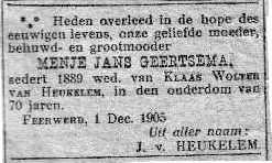 Menje/Minje/Meinje Jans Geertsema/Geersema, geb. ca. 1835 te Adorp overl. 1-12-1905 te Feerwerd (Ezinge), 70 jaar