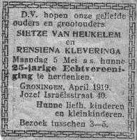 Rensiena Kleveringa (Sien) dochter van Tjeert Jans Klevringa, wegwerker en Reina Geerdina Wijma geb. 1857/1858 te Nuis (Marum) overl. 19-2-1934 te Groningen