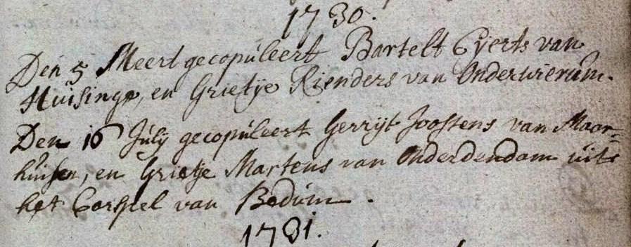 registratie huwelijk 12-2-1730 te Huizinge met attestatie naar Onderwierum