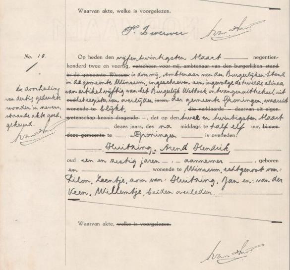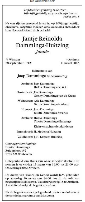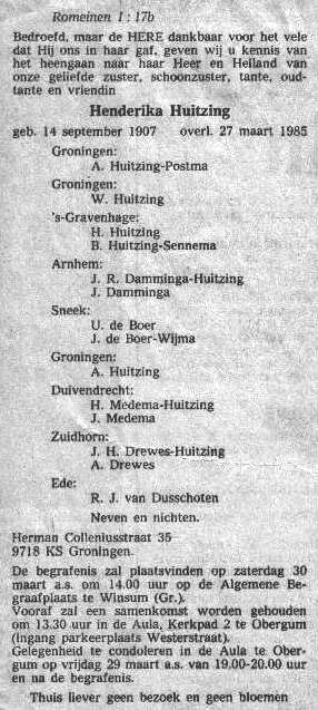 Arend Hendrik Huitzing, timmerman, aannemer te Winsum zoon van Jan Huitzing en Willempje van der Veen kleinzoon van Jantje Pieters Bus en Jan Jans Huitzing achterkleinzoon van Pieter Eisses Bus en Trijntje Pieters Medema geb. 21-5-1880 te Winsum overl. 22-3-1942 te Groningen