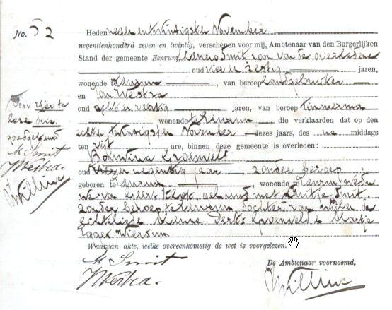 Bouwina Groenveld, naaister dochter van Menne Derks Groenveld en Martje Egges Wiersum) na het overlijden van Gerrit Klok huwt zij 5-6-1861 Luitje Smit, aannemer/kastelein en krijgt 6 kinderen waarvan tenminste 3 gehuwd zijn geb. 13-12-1833 te Eenrum overl. 28-11-1927 te Eenrum, bijna 94 jaar |