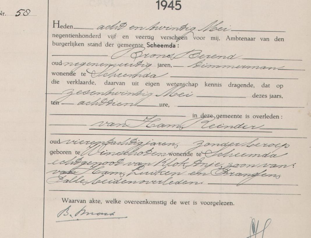 Reinder van Ham, smid te Hellum (bij Schildwolde) geb. 15-12-1860 te Winschoten overl. 26-5-1945 te Scheemda zoon van Luiken van Ham geb. te Beerta, voerman 24-5-1856 te Beerta gehuwd met Talle Fransen geb. te Oostwold, dienstmeid |