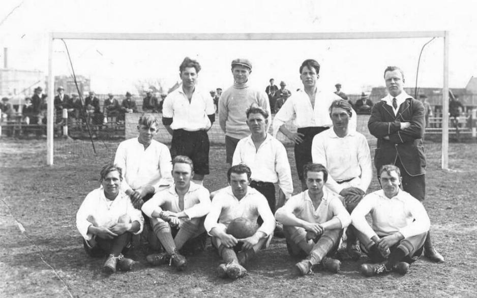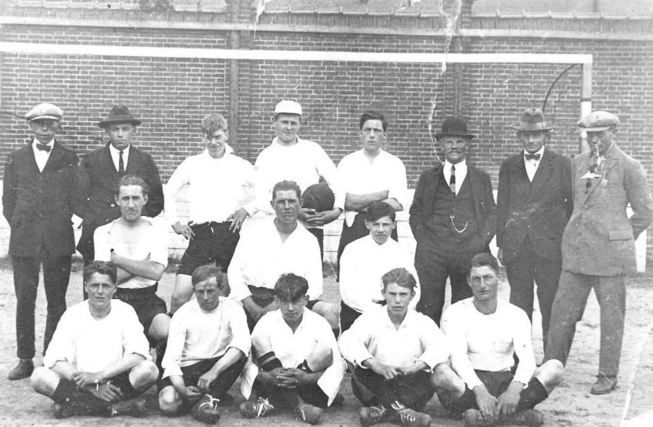 Hieronder een foto van dit eerste elftal genomen voor een uitwedstrijd in Hoek van Holland