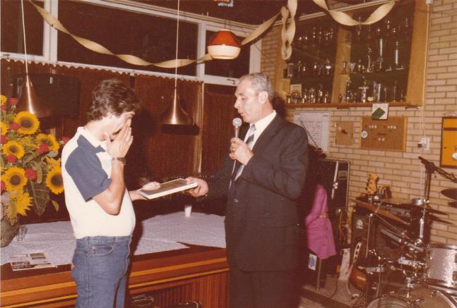 Hier reikt voorzitter Ab Fröling het eerste diploma uit aan Jan de Zoete Sr
