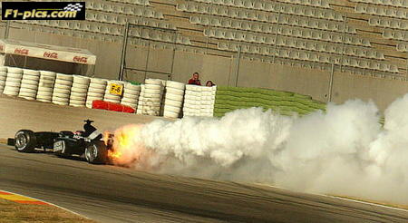 Takuma Sato of Japan's BAR Honda catches fire during Formula 1 testing at the Ricado Tormo circuit in Valencia, Spain, Wednesday Jan. 28, 2004. (AP Photo/Ramon Espinosa)