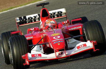 Ferrari F1 German driver Michael Schumacher drives his race car during a test session at Mont Melo race track outside of Barcelona, Spain, Thursday, Jan. 22, 2004.(AP Photo/Andreu Dalmau/EFE)