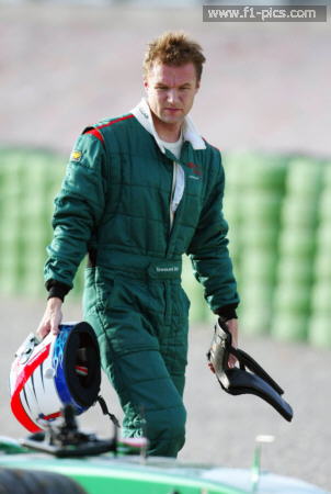 Townsend Bell walks in during his one-day test with Jaguar Racing in 2003