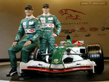 Formula One drivers Australian Mark Webber (L) and Austrian Christian Klien (R) pose for photographers during the new Jaguar R5 car launching ceremony at Montmelo racetrack in Barcelona, Spain January 18, 2004. REUTERS/Albert Gea