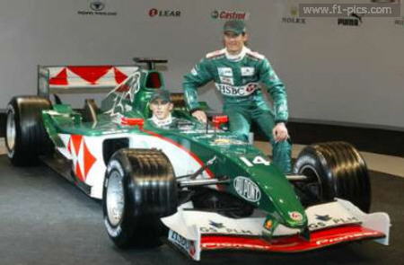 Formula One drivers Australian Mark Webber (R) and Austrian Christian Klien (L) pose for photographers during the new Jaguar R5 car launching ceremony at Montmelo racetrack in Barelona Spain January 18, 2004. REUTERS/Albert Gea
