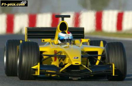 Belgian Formula One driver Bas Leinders take a curve in his Jordan at the Montmelo race track, Spain, January 21, 2004. REUTERS/Gustau Nacarino