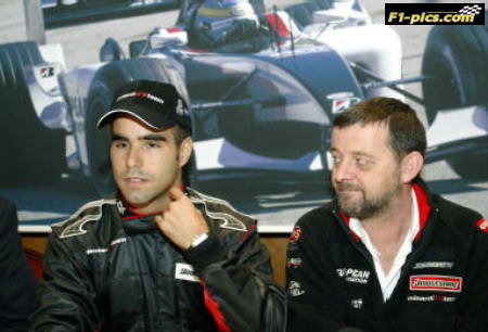 Leader of Minardi Formula One team Paul Stoddart (R) looks at his team driver Hungarian Zsolt Baumgartner in Budapest, 15 February 2004 as the new team members are introduced to press.