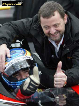 Minardi Australian team chief Paul Stoddart gives a thumbs up with his team's new Hungarian Formula one driver, Zsolt Baumgartner, as he sits in the two sits Minardi race car in Budapest, February 15, 2004. REUTERS/Laszlo Balogh