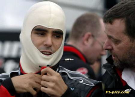 Minardi Australian team chief Paul Stoddart (R) talks his team's new Hungarian Formula One driver Zsolt Baumgartner as he adjust his hood in Budapest, February 15, 2004. REUTERS/Laszlo Balogh