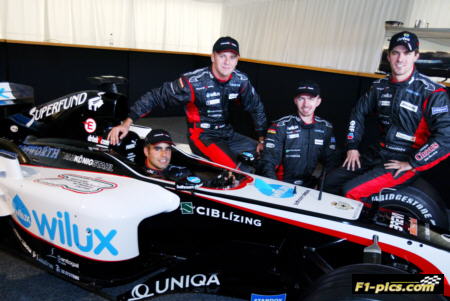 Minardi's 2004 drivers - Zsolt Baumgartner (in car), Bas Leinders, Gianmaria Bruni, Zsolt Baumgartner, and Tiago Monteiro at the Minardi launch in Melbourne, march 3, 2004