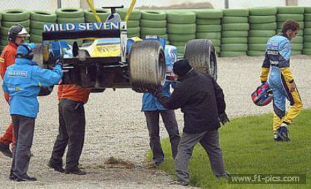 Franck Montagny of France walks away from his Formula 1 Renault after crashing it during a tire testing session at the Cheste race track outside of Valencia, Spain, Friday Nov. 28, 2003. (AP Photo/Ramon Espinosa)
