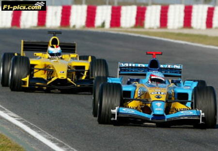 Renault Formula one driver Fernando Alonso of Spain (R) and Jordan Bas Leinders of Belgium take part in a training session at the Montmelo racetrack in Barcelona, 21 January 2004.