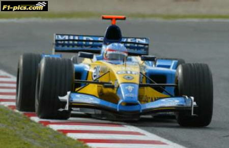 Spanish Formula One driver Fernando Alonso tests his Renault at the Montmelo racetrack, Spain, January 21, 2004. REUTERS/Gustau Nacarino