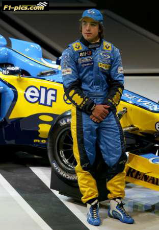 Spanish driver Fernando Alonso poses during a photocall at the launch of the R24, Renault's new Formula One racing car, at Teatro Massimo in Palermo, southern Italy, January 29, 2004. REUTERS/Tony Gentile