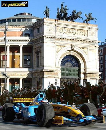 Renault Formula 1 Team driver Jarno Trulli of Italy speeds his new Renault R24 Formula 1 racing car past the historical Politeama theater during it's presentation, in Palermo, Italy, Thursday, Jan. 29, 2004. (AP Photo/Andrew Medichni)