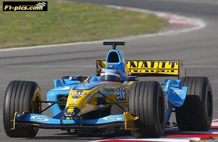 Renault F1 Spanish driver Fernando Alonso, drives his race car during a test session at Montmelo race track in Barcelona, Spain, Tuesday, Feb. 3, 2004. (AP Photo/Bernat Armangue)
