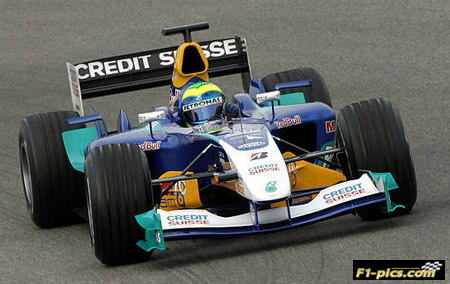 Sauber F1 Brazilian driver Felipe Massa drives his race car around a curve during a test session in Jerez, Spain,Tuesday, Feb. 10, 2004. (AP Photo/Raul Diaz)