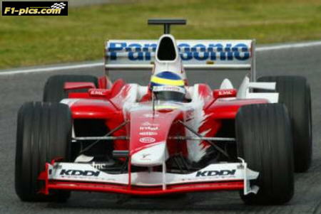 Brazilian Formula One driver Ricardo Zonta takes a curve during test session at the Montmelo racetrack in Spain, January 21, 2004. REUTERS/Gustau Nacarino