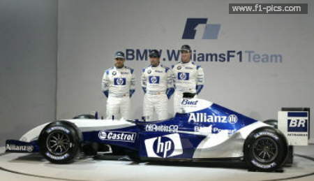 The three BMW Williams drivers Colombian Pablo Montoya (L), Spanish Marc Gene (C) and German Ralf Schumacher (R) pose with the new BMW FW26 which was presented at Cheste near Valencia 05 January 2004. AFP PHOTO JOSE JORDAN