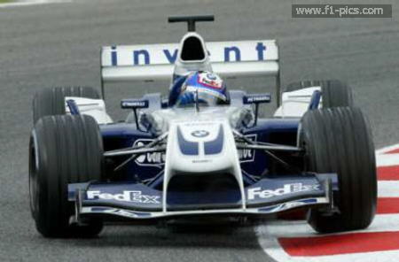 Colombian Formula One driver Juan Pablo Montoya takes a curve during testing of his new BMW Williams FW 26 car, at Montmelo racetrack, Spain, January 20, 2004. REUTERS/Gustau Nacarino