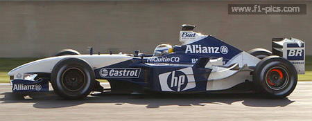 Formula One driver Juan Pablo Montoya, from Colombia, reduces speed in his Williams car during a testing session at the Montmelo race track, near Barcelona, Spain Wednesday, Jan. 21, 2004. (AP Photo/Bernat Armangue)